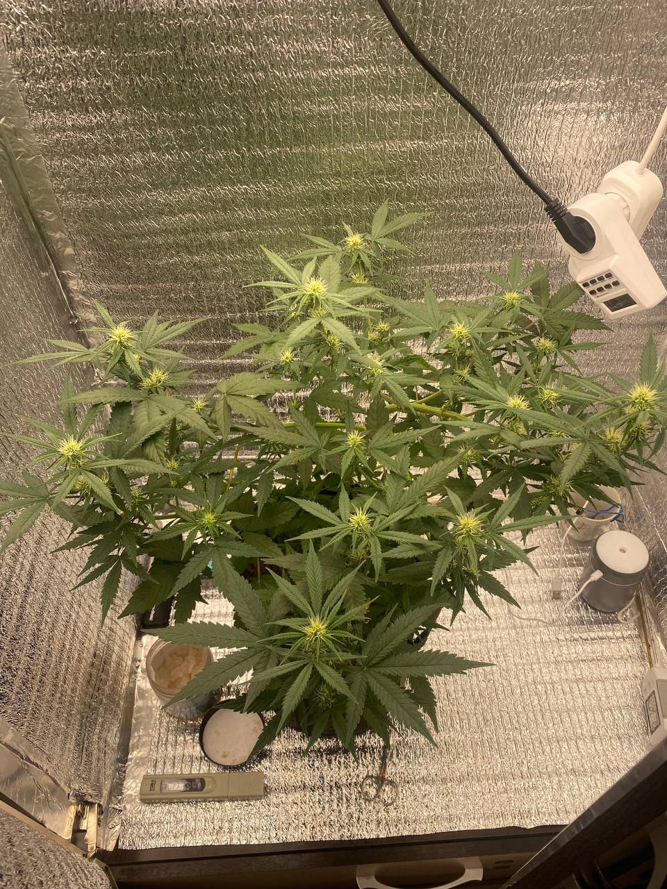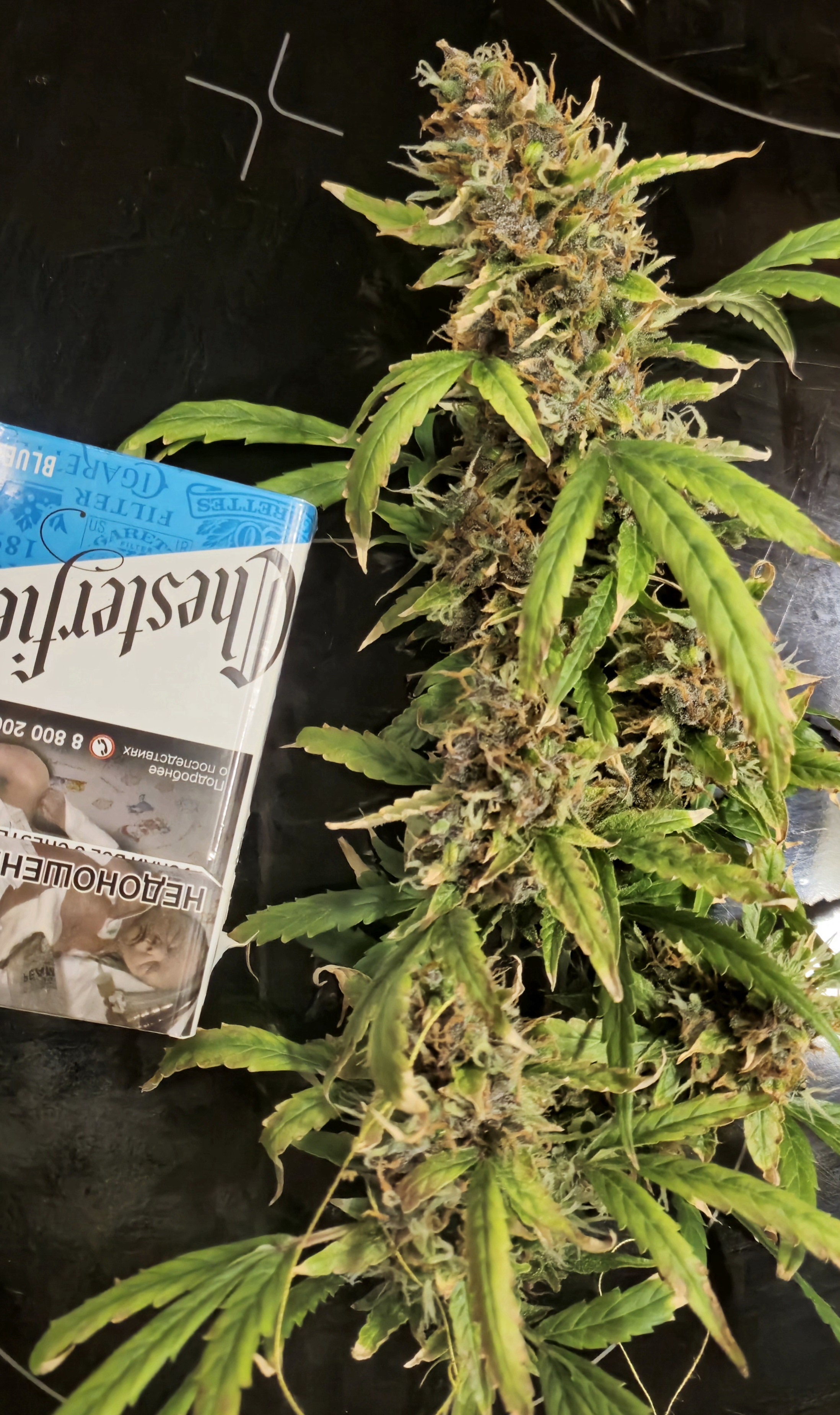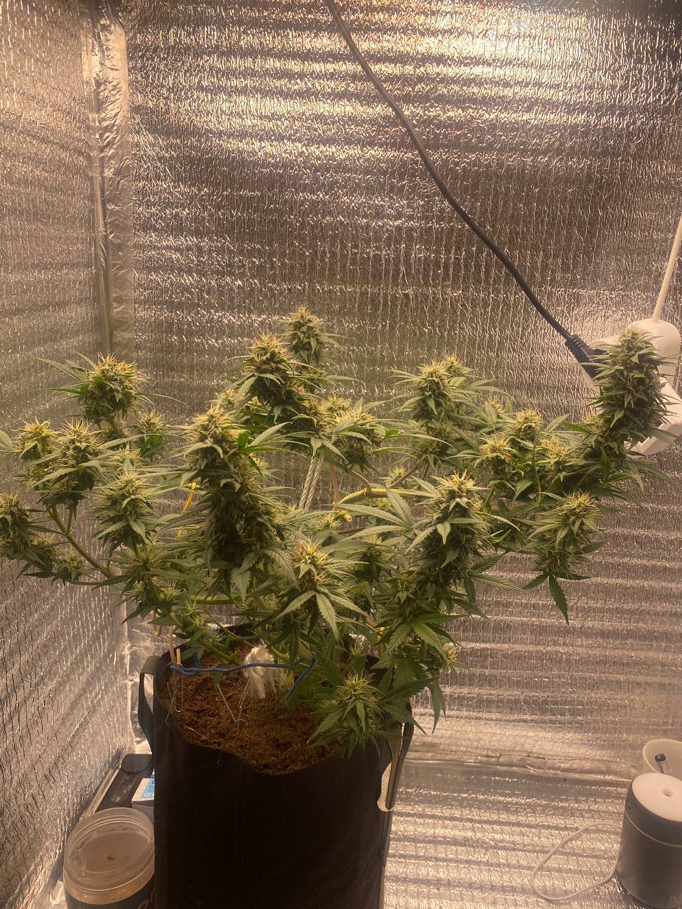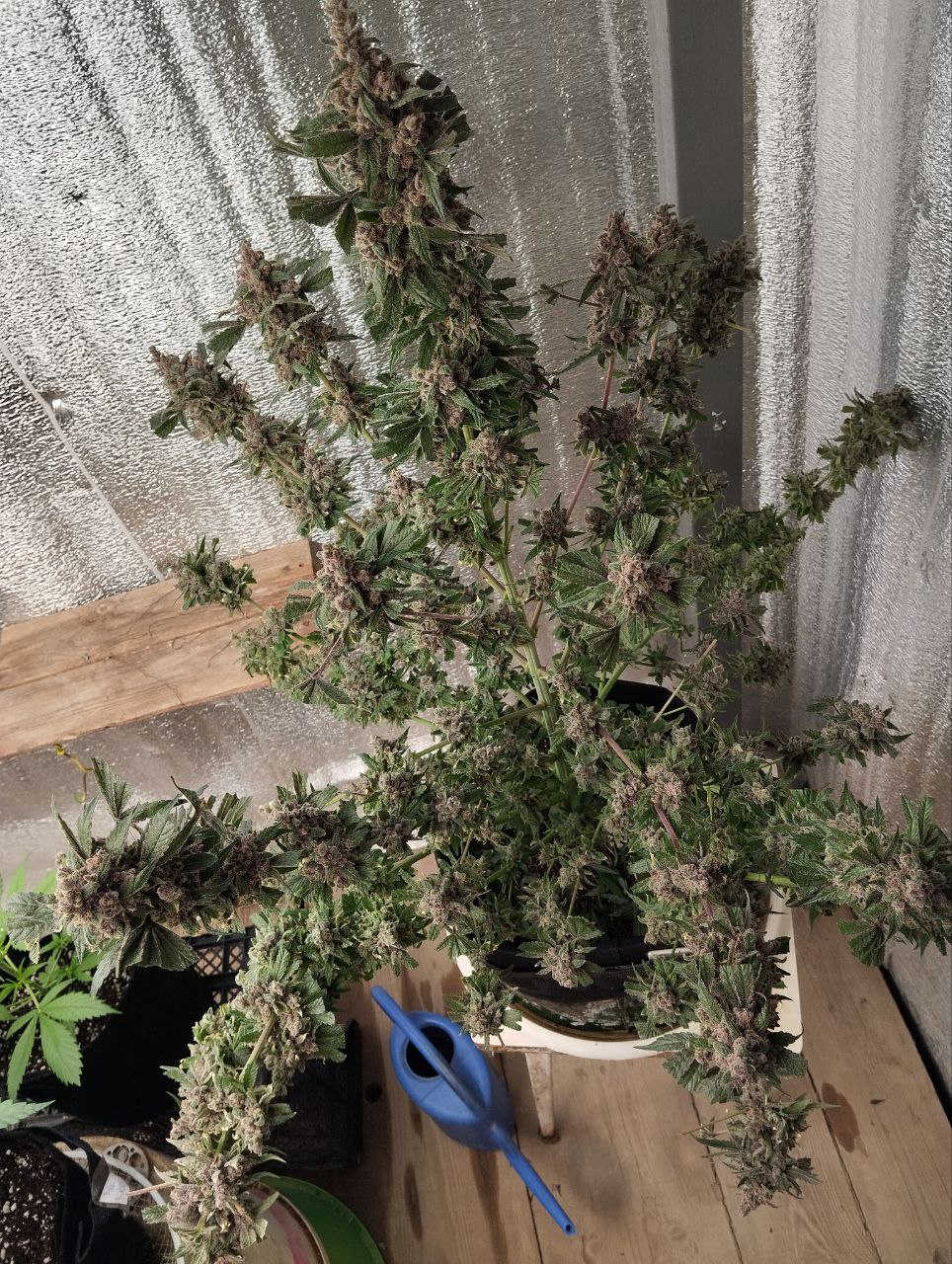 Посадил 16 марта, сейчас уже потихоньку подходит к концу, на кусту думаю грамм 40 сухого точно есть, загадывать пока не буду. грунт 10 литров поливаю 2л рост цветка 145 от земли, листочки начинают быть фиолетовыми и очень красиво) ростет с геометрической прогрессией, с челухи уже прёт от 2х поднятий с воды, очень хорошо расслабляет, но если перебрать можно отключиться как это было с моим кентом, настоятельно рекомендую, но лучше делать 2-3 перерывчик не большой) Ребятам с гроверз отдельное спасибо за качественный продукт, всегда буду тут. ❤️