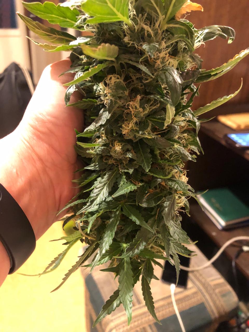 Запах действительно очень резкий и бошки липкие невероятно. Шишки плотные, как хотелось бы, высохнут немного плотнее. В целом очень легко выращивать, не делая с ним ничего особенного. Влажный вес обоих растений составил 924 грамма.