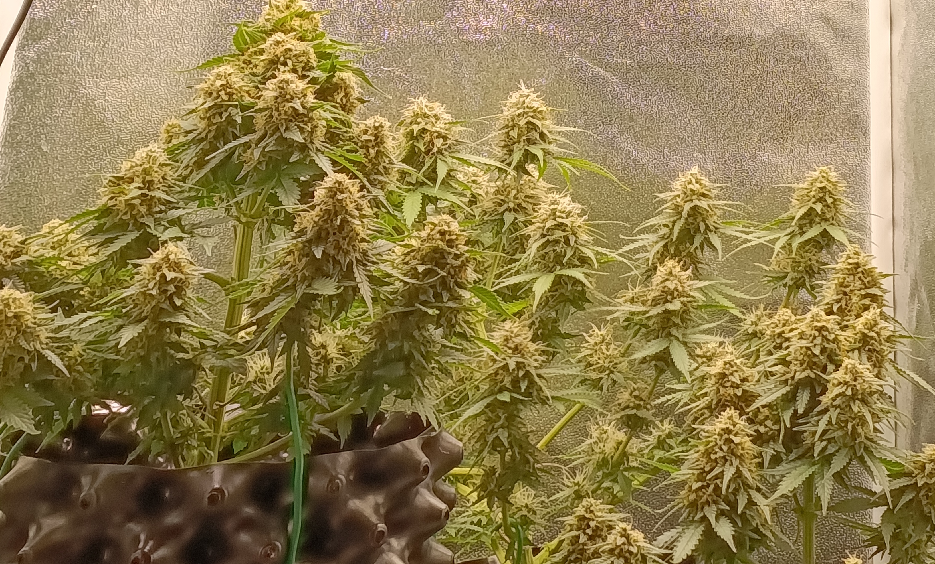 Под 100 вт с светодиодов и 40х40х160 гроутента собрал с куста за 99 дней примерно 90гр. При том что трихомы были мутные белого цвета, а не янтарного, но листья уже пожелтели. Вкус и правда сосны, в горле остается после употребления холодок. Проблем с этим сортом не возникало. Даже жару 30+ градусов выдержал. Плесени не было, хотя влажность стояла 60% где то.