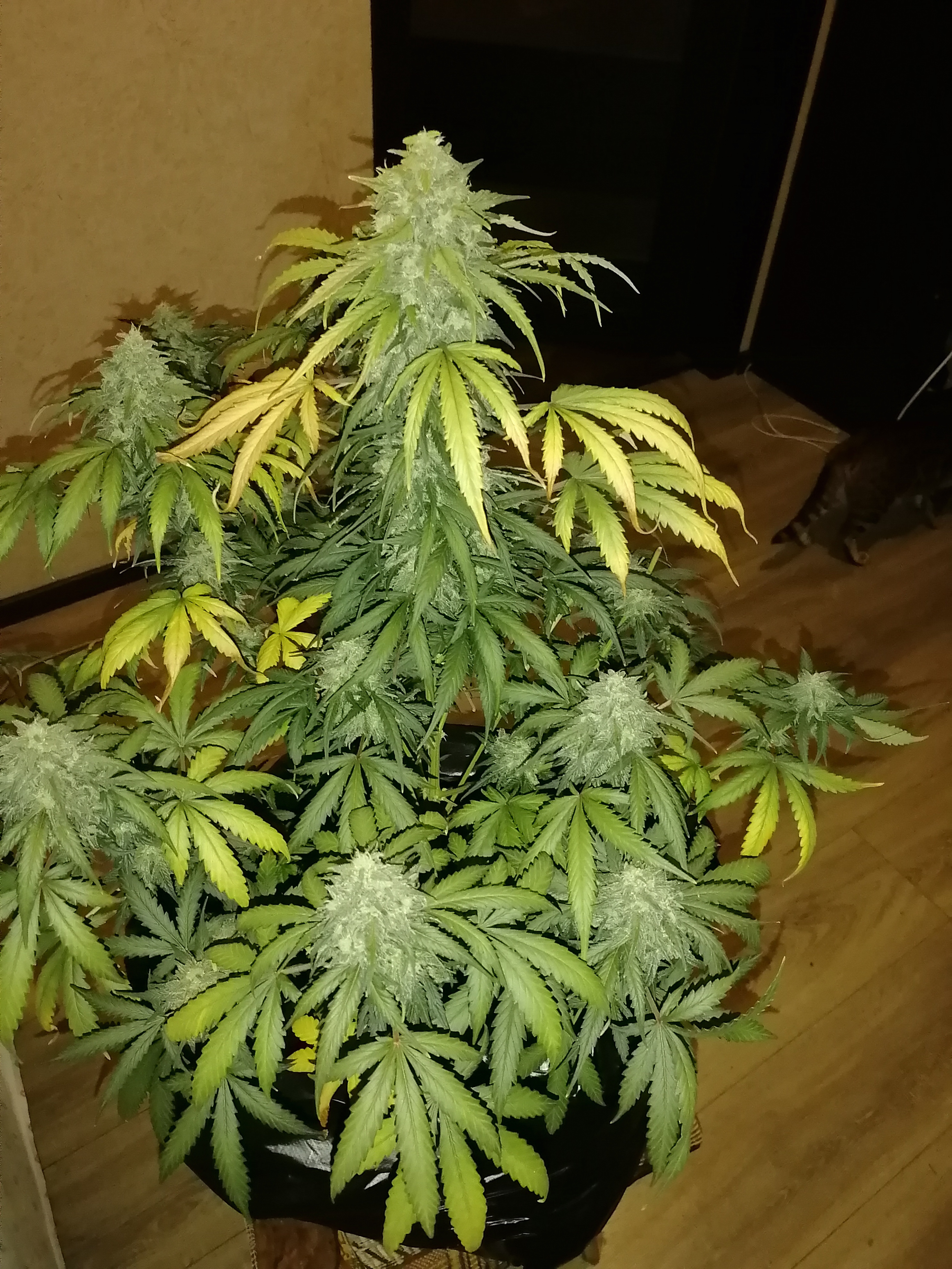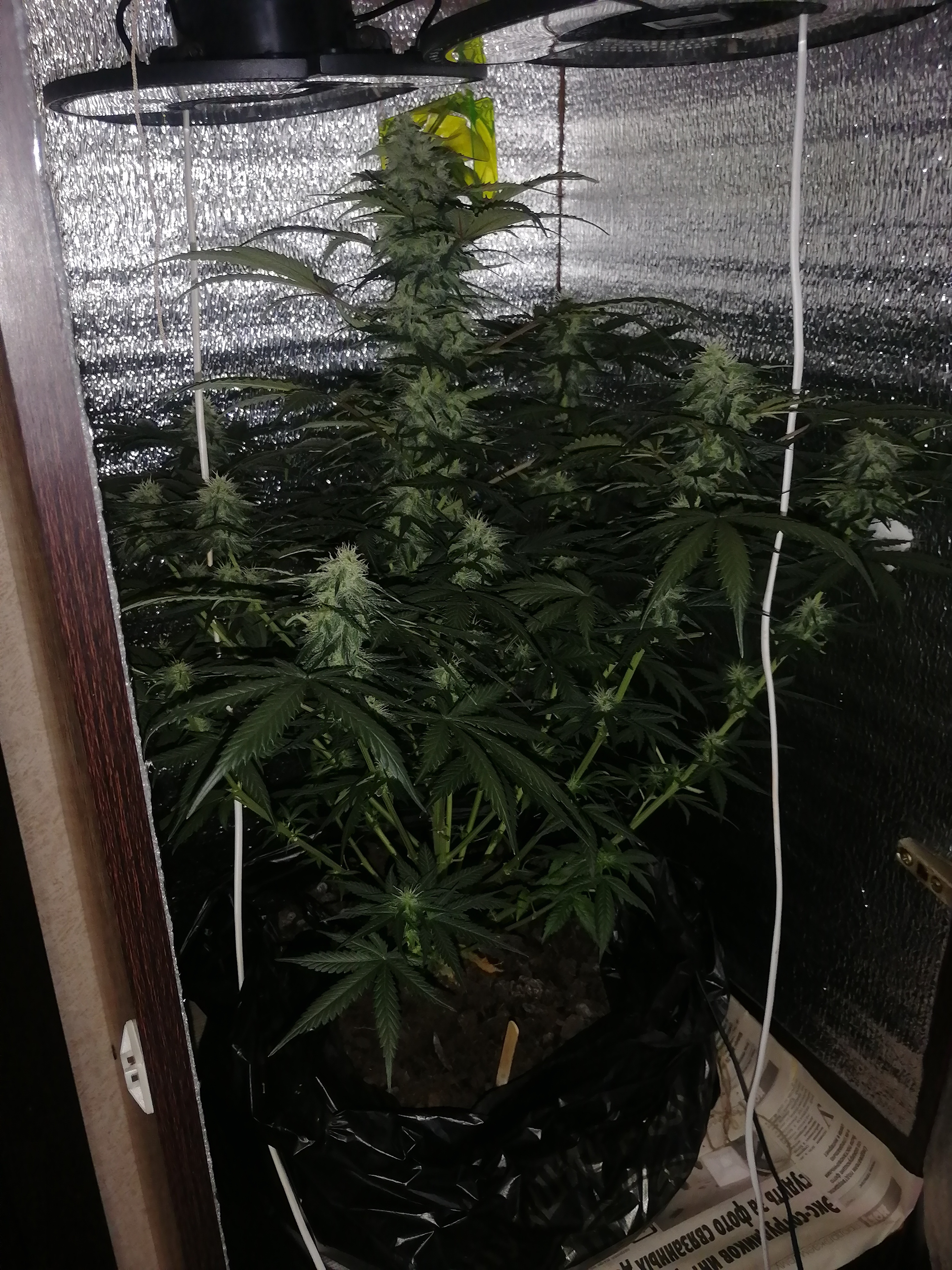 Всем привет, досталась семка бонусом ростёт уже 4 месяц рост маленький 45 см, но боковые это капец на весь шкаф в ширь, бошки лезут со всех щилей их так много что глаза разбегаются. Запах не сильный листья все в кристалах, кстате накуривают не хуёго всем доволен магазу большое спосибо как сниму урожай отпишусь.
